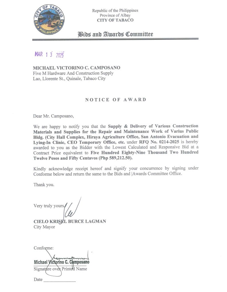 Notice of Award: Supply & Delivery of Various Construction Materials & Supplies for the Repair & Maintenance Work of Various Public Bldg. (City Hall Complex, Hiraya Agriculture Office, San Antonio Evacuation & Lying-In Clinic, CEO Temporary Office, etc.), PR No. 25-02-0240