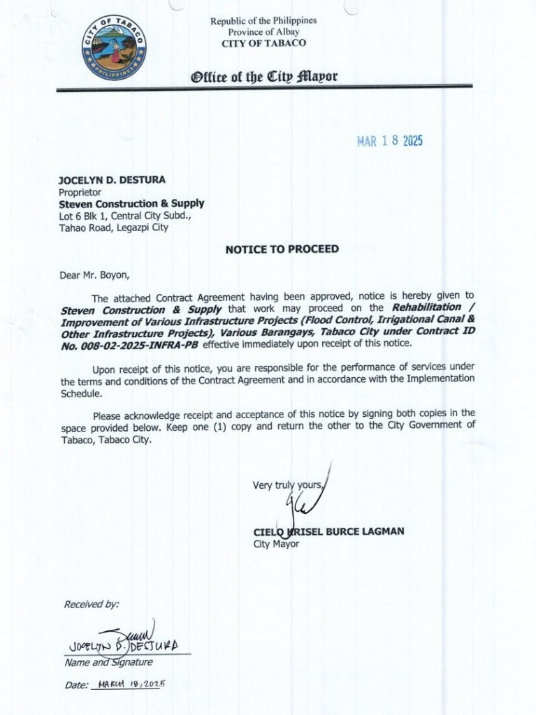 Notice to Proceed: Rehabilitation / Improvement of Various Infrastructure Projects (Flood Control, Irrigational Canal & Other Infrastructure Projects), Various Barangays, Tabaco City under Contract ID No. 008-02-2025-INFRA-PB