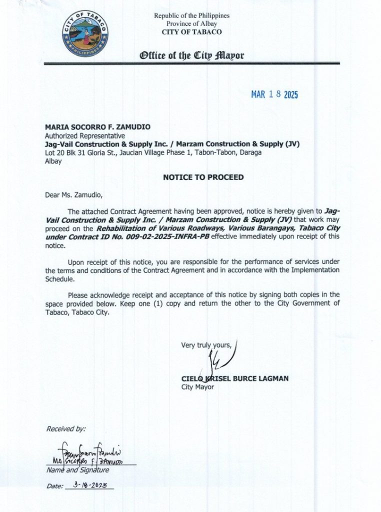 Notice to Proceed: Rehabilitation of Various Roadways, Various Barangays, Tabaco City under Contract ID No. 009-02-2025-INFRA-PB 2025, Bids and Awards - Posted by: [ Melissa Biron] Download: NTP-009 – Jagvail Construction & Supply Inc. / Marzam Construction & Supply (JV)Download Contract-009 – Jagvail Construction & Supply Inc. / Marzam Construction & Supply (JV) Download
