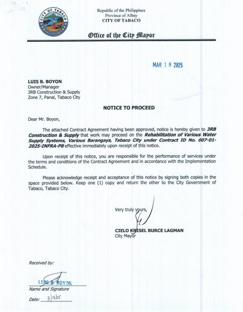 Notice to Proceed: Rehabilitation of Various Water Supply Systems, Various Barangays, Tabaco City under Contract ID No. 007-01-2025-INFRA-PB