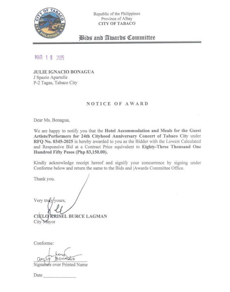 Notice of Award: Hotel Accommodation & Meals for the Guest Artists/Performers for the 24th Cityhood Anniversary Concert of Tabaco City, PR No. 25-03-0379 2025, Bids and Awards - Posted by: [ Melissa Biron] Download: Award Reso-25-03-0379 – J Spazio Apartelle Download Notice of Award-25-03-0379 – J Spazio Apartelle Download Purchase Order-25-03-0379 – J Spazio ApartelleDownload