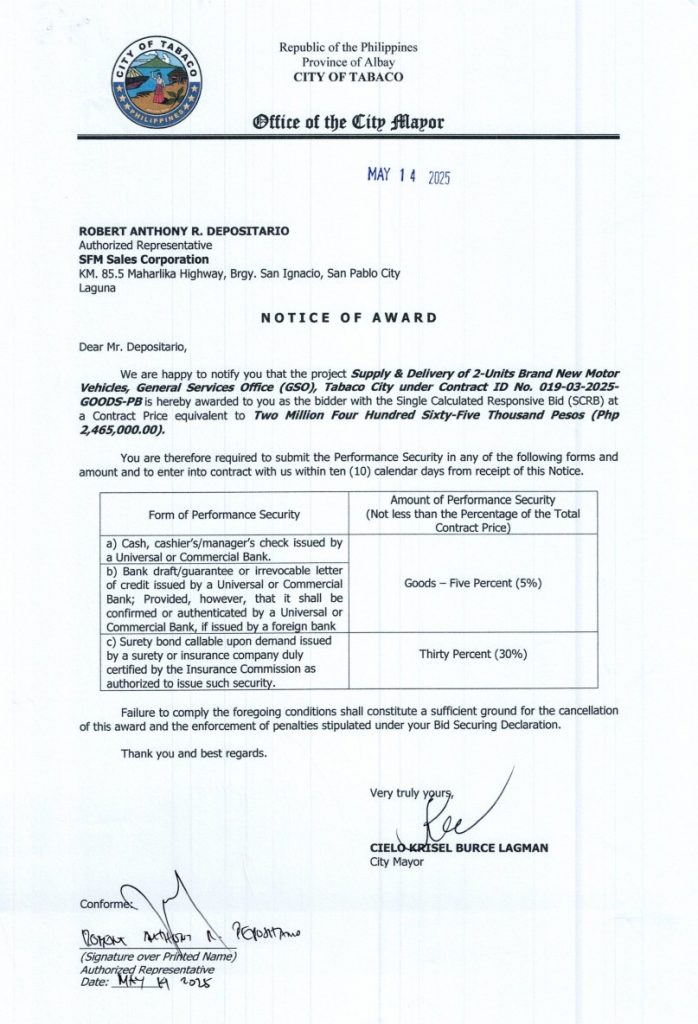 Notice of Award: Supply & Delivery of 2-Units Brand New Motor Vehicles, General Services Office (GSO), Tabaco City under Contract ID No. 019-03-2025-GOODS-PB 2025, Bids and Awards - Posted by: [ Melissa Biron] Download: Reso Award-019 – SFM Sales CorporationDownload NOA-019 – SFM Sales Corporation Download