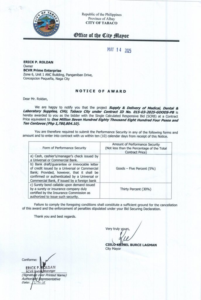 Notice of Award: Supply & Delivery of Medical, Dental & Laboratory Supplies, CHU, Tabaco City under Contract ID No. 015-03-2025-GOODS-PB 2025, Bids and Awards - Posted by: [ Melissa Biron] Download: Reso-Award-015 – BCVR Prime Enterprise Download NOA-015 – BCVR Prime EnterpriseDownload