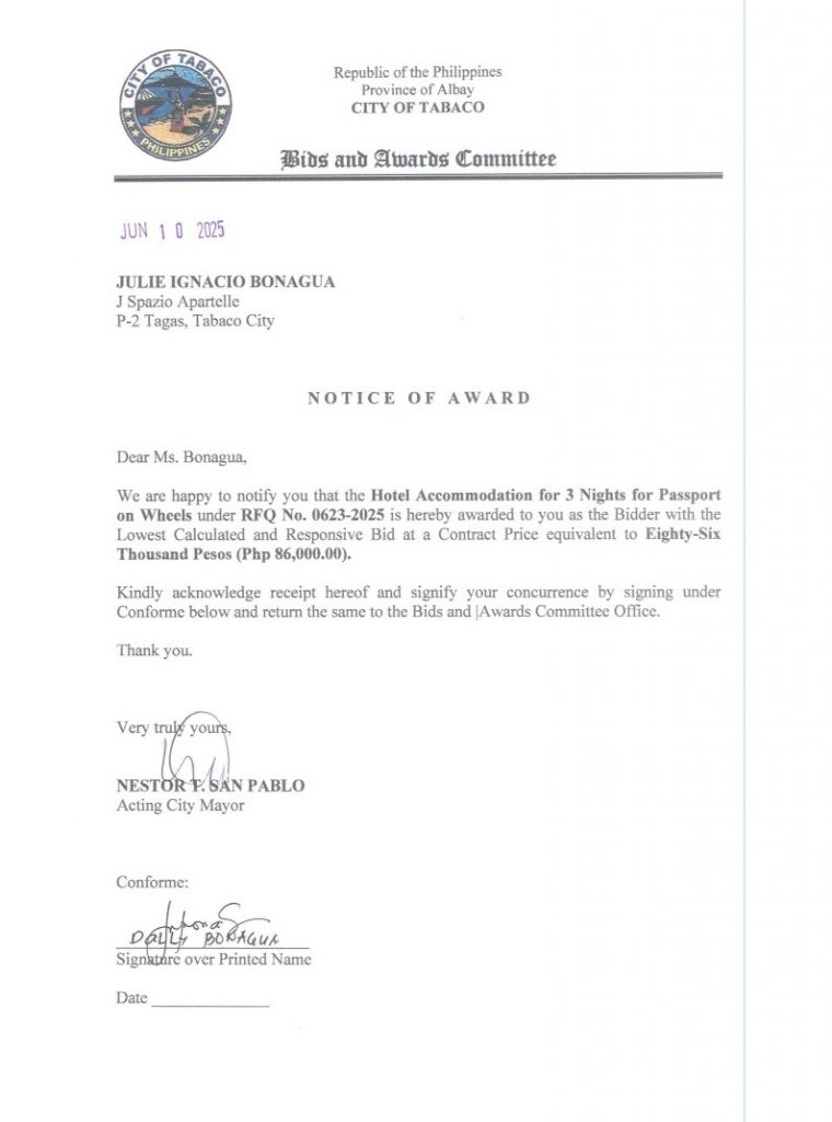 Notice of Award: Hotel Accommodation for 3 Nights for Passport on Wheels, PR No. 25-06-0723 2025, Bids and Awards - Posted by: [ Melissa Biron] Download: Award Reso-25-06-0723 – J Spazio ApartelleDownload Notice of Award-25-06-0723 – J Spazio Apartelle Download Purchased Order-25-06-0723 – J Spazio Apartelle Download