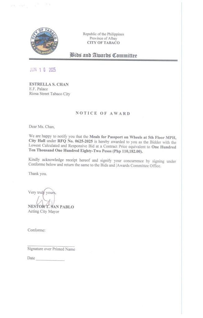 Notice of Award: Meals for Passport on Wheels at 5th Floor MPH, City Hall, PR No. 25-06-0727 2025, Bids and Awards - Posted by: [ Melissa Biron] Download: Award Reso-25-06-0727 – E.F. PalaceDownload Notice of Award-25-06-0727 – E.F. Palace Download Purchased Order-25-06-0727 – E.F. Palace Download