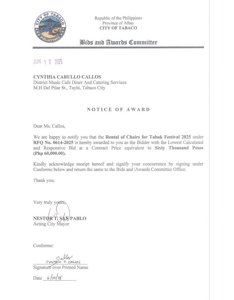 • REQUEST FOR QUOTATION (RFQ)- The City Government of Tabaco through its Bids and Awards Committee (BAC), intends to procure "3-Days Catering Services for the Mega Health Caravan" with an Approved Budget for the Contract (ABC) amounting to Three Hundred Thirty-Four Thousand, Five Hundred Pesos (Php 334,500.00) through Section 34 Small Value Procurement of the Implementing Rules and Regulations of RA No. 12009.