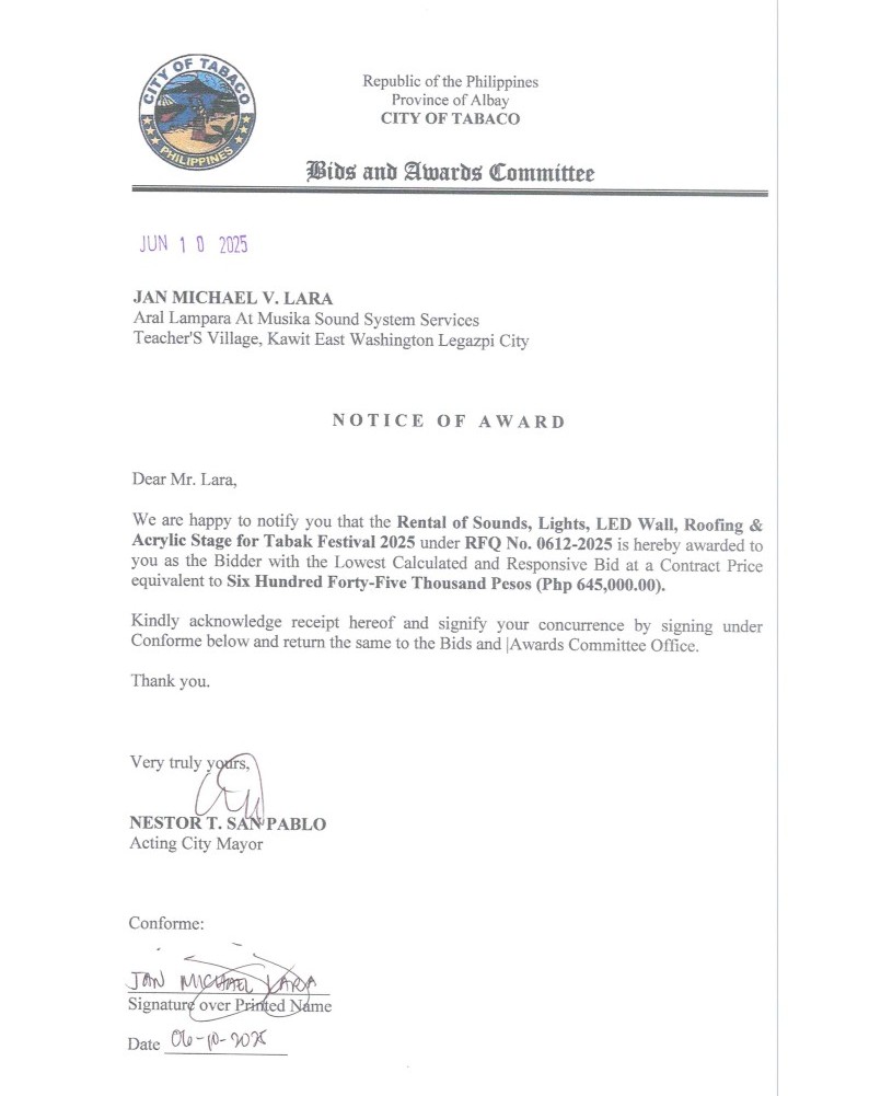 Notice of Award: Rental of Sounds, Lights, LED Wall, Roofing & Acrylic Stage for Tabak Festival 2025, PR No. 25-06-0712 2025, Bids and Awards - Posted by: [ Melissa Biron] Download: Award Reso-25-06-0712 – Aral Lampara at Musika Sound System ServicesDownload Notice of Award-25-06-0712 – Aral Lampara at Musika Sound System Services Download Purchased Order-25-06-0712 – Aral Lampara at Musika Sound System Services Download