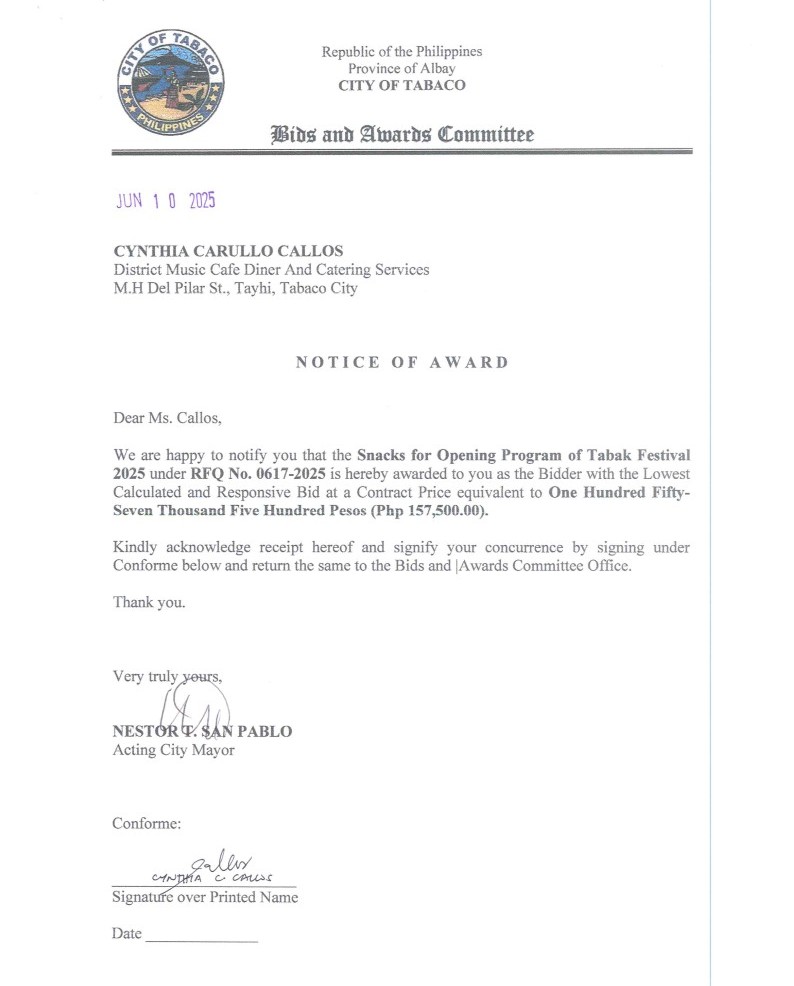 Notice of Award: Snacks for Opening Program of Tabak Festival 2025, PR No. 25-069-0717 2025, Bids and Awards - Posted by: [ Melissa Biron] Download: Award Reso-25-06-0717 – District Music Cafe Diner & Catering ServicesDownload Notice of Award-25-06-0717 – District Music Cafe Diner & Catering Services Download Purchased Order-25-06-0717 – District Music Cafe Diner & Catering Services Download