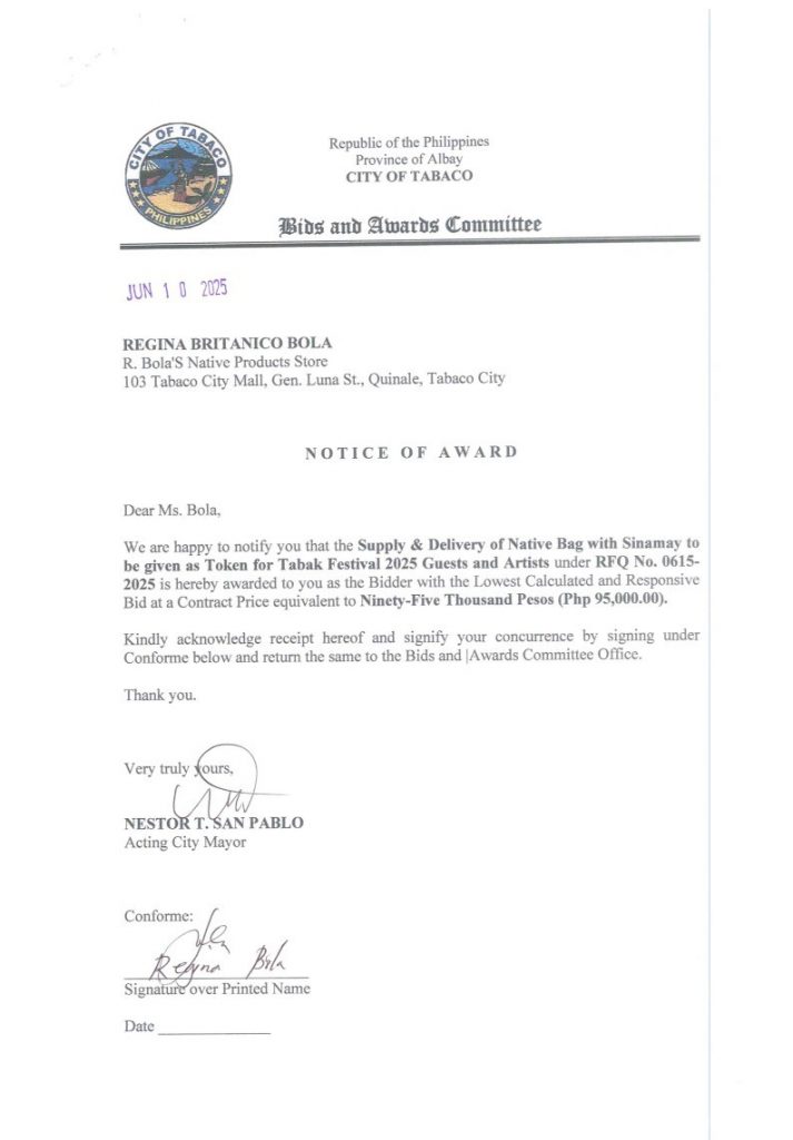 Notice of Award: Supply & Delivery of Native Bag with Sinamay to be given as Token for Tabak Festival 2025 Guests & Artist, PR No. 25-065-0715 2025, Bids and Awards - Posted by: [ Melissa Biron] Download: Award Reso-25-06-0715 – R. Bola’s Native Products StoreDownload Notice of Award-25-06-0715 – R. Bola’s Native Products Store Download Purchased Order-25-06-0715 – R. Bola’s Native Products Store Download