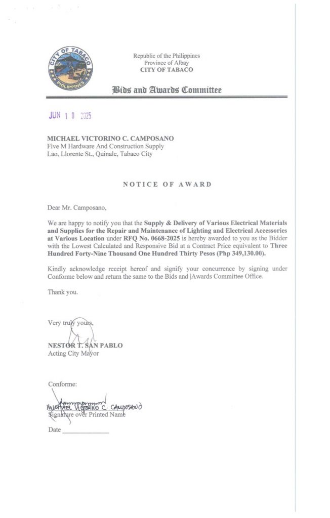 Notice of Award: Supply & Delivery of Various Electrical Materials & Supplies for the Repair & Maintenance of Lighting & Electrical Accessories at Various Location, PR No. 25-06-0776 2025, Bids and Awards - Posted by: [ Melissa Biron] Download: Award Reso-25-06-0776 – Five M Hardware & Construction Supply Download Notice of Award-25-06-0776 – Five M Hardware & Construction Supply Download Purchase Order-25-06-0776 – Five M Hardware & Construction SupplyDownload