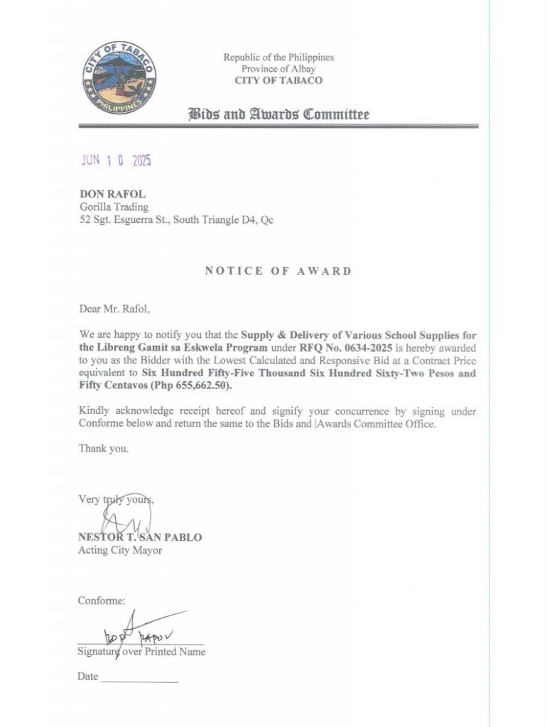 Notice of Award: Supply & Delivery of Various School Supplies for the Libreng Gamit sa Eskwela Program, PR No. 25-06-0741