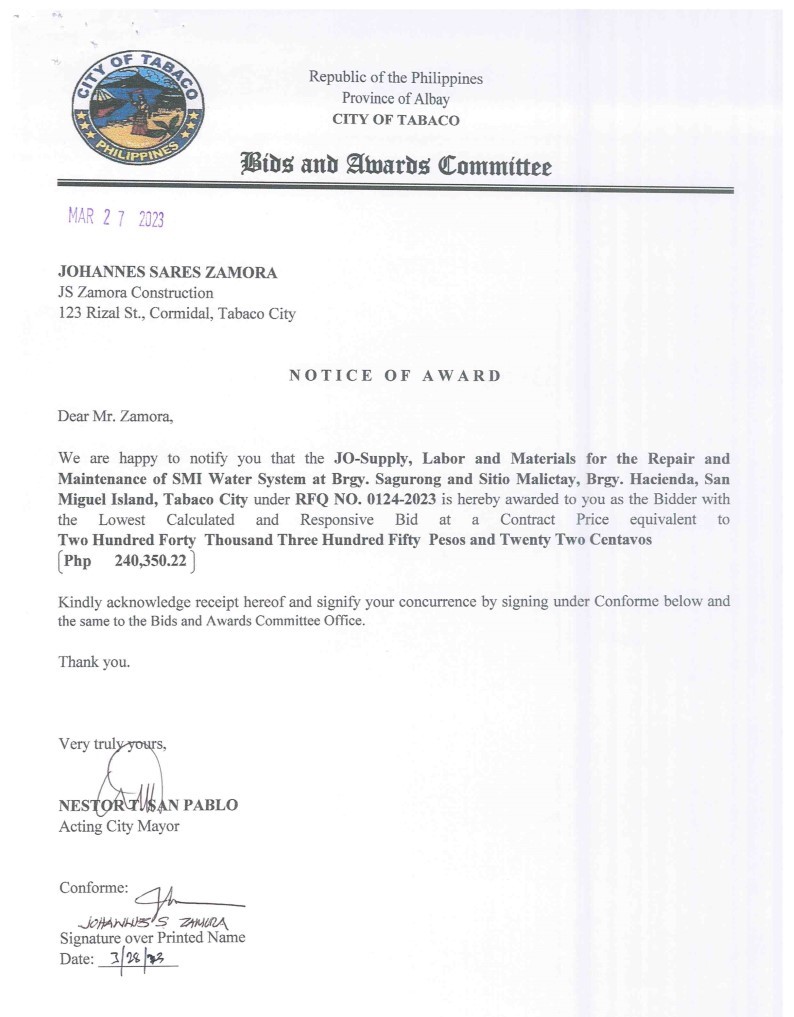 Notice of Award: JO-Supply, Labor and Materials for the Repair and Maintenance of SMI Water System at Brgy. Sagurong and Sitio Malictay, Brgy. Hacienda, San Miguel Island, Tabaco City, PR No. 23-03-0145
