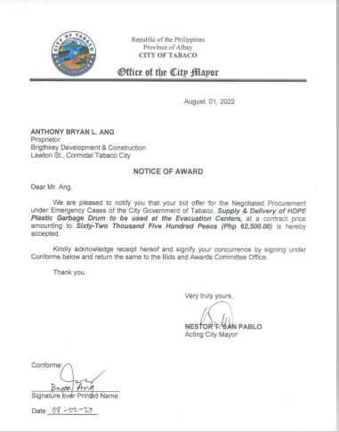 • NOTICE OF AWARD (NOA)- TO O.R. ROCHA CONSTRUCTIONS AND SUPPLY FOR "Job Order-Labor, Materials and Equipment for the Fabrication and Installation of Early Warning Device / Signages" with an Approved Budget for the Contract (ABC) amounting to Nine Hundred Ninety-Nine Thousand, Eight Hundred Eighteen Pesos (Php 999,818.00) through Section 34 Small Value Procurement of the Implementing Rules and Regulations of RA No. 12009.