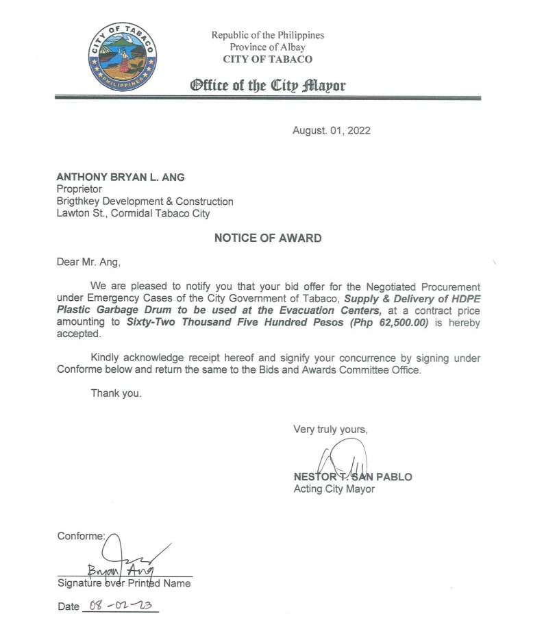 Notice of Award: Supply and Delivery of HDPE Plastic Garbage Drum to be used at the Evacuation Centers, PR No.23-07-0935 2023, Bids and Awards - Posted by: [ Melissa Biron] Download: Bac-Reso: PR No.23-07-0935-Brightkey Development & ConstructionDownload Notice of Award: PR No.23-07-0935-Brightkey Development & Construction Download Purchase Order: PR No.23-07-0935-Brightkey Development & Construction Download