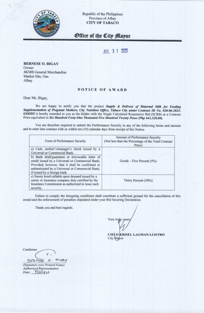 NOTICE OF AWARD: Supply & Delivery of Maternal Milk for Feeding Supplementation of Pregnant Mothers, City Nutrition Office, Tabaco City, Contract ID No. 020-06-2023-GOODS 2023, Bids and Awards - Posted by: [ Melissa Biron] Notice of Award-020Download BAC Resolution-Award-020Download