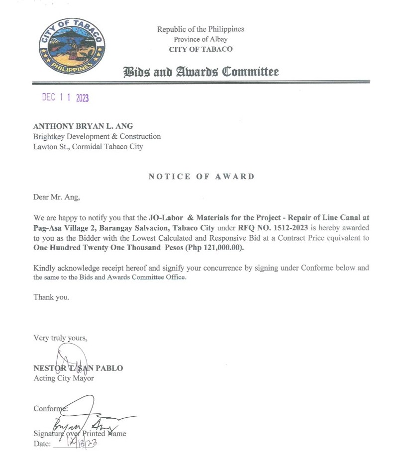 Notice of Award: JO-Labor & Materials for the Project – Repair of Line Canal at Pag-Asa Village 2, Barangay Salvacion, Tabaco City, PR No.23-11-1703