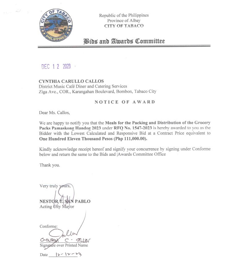 • REQUEST FOR QUOTATION (RFQ)- The City Government of Tabaco through its Bids and Awards Committee (BAC), intends to procure "3-Days Catering Services for the Mega Health Caravan" with an Approved Budget for the Contract (ABC) amounting to Three Hundred Thirty-Four Thousand, Five Hundred Pesos (Php 334,500.00) through Section 34 Small Value Procurement of the Implementing Rules and Regulations of RA No. 12009.