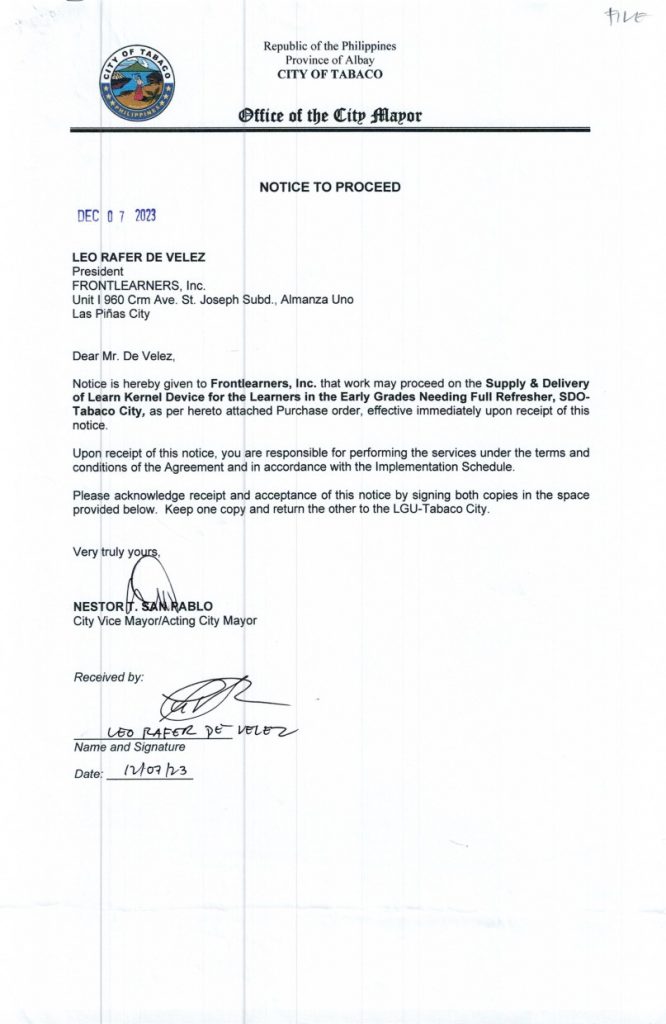 Notice to Proceed: Supply & Delivery of Learn Kernel Device for the Learners in the Early Grades Needing Full Refresher, SDO-Tabaco City, PR No. 23-11-1676