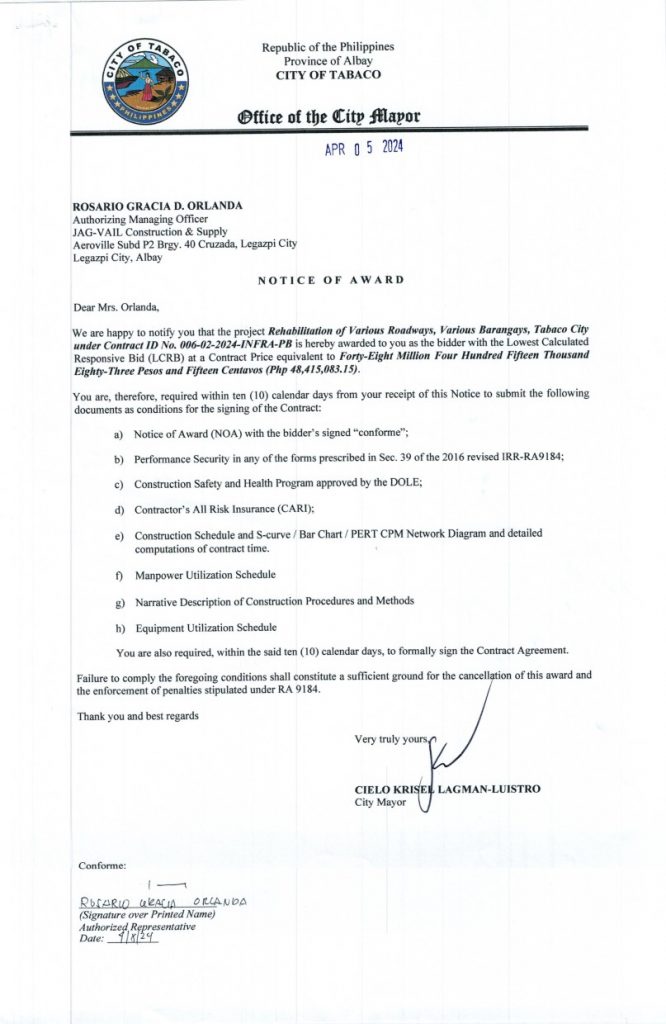 NOTICE OF AWARD: Rehabilitation of Various Roadways, Various Barangays, Tabaco City, Contract ID No. 006-02-2024-INFRA-PB 2024, Bids and Awards - Posted by: [ Melissa Biron] Notice of Award-006Download Reso-Award-006Download