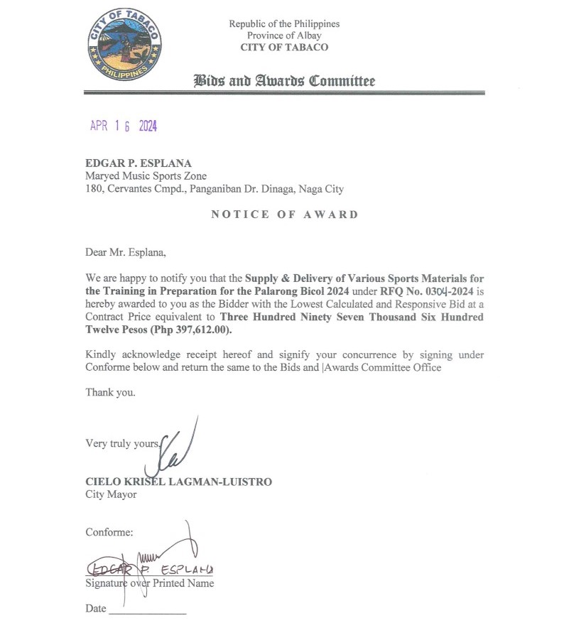 Notice of Award: Supply & Delivery of Various Sports Materials for the Training in Preparation for the Palarong Bicol 2024, PR No. 24-04-0342 2024, Bids and Awards - Posted by: [ Melissa Biron] Download: Award Reso-24-04-0342 – Maryed Music Sports Zone Download NOA-24-04-0342 – Maryed Music Sports Zone Download PO-24-04-0342 – Maryed Music Sports ZoneDownload