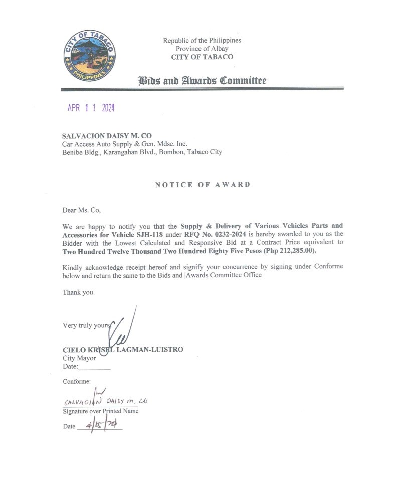 Notice of Award: Supply & Delivery of Various Vehicle Parts & Accessories for Vehicle SJH-118, PR No. 24-03-0255 2024, Bids and Awards - Posted by: [ Melissa Biron] Download: Award Reso-24-03-0255 – Car Access Auto Supply & Gen. Mdse. Inc.Download NOA-24-03-0255 – Car Access Auto Supply & Gen. Mdse. Inc. Download PO-24-03-0255 – Car Access Auto Supply & Gen. Mdse. Inc. Download