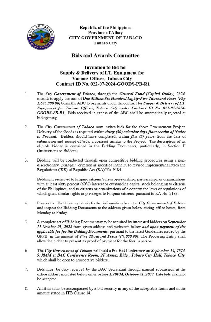 Invitation to Bid: Supply & Delivery of I.T. Equipment for Various Offices, Tabaco City, Contract ID No. 022-07-2024-GOODS-PB-R1 2024, Bids and Awards - Posted by: [ Melissa Biron] Invitation to Bid-ID-No.-022-07-2024-GOODS-PB-R1Download Bidding Documents: PBD-ID-No.-022-07-2024-GOODS-PB-R1Download