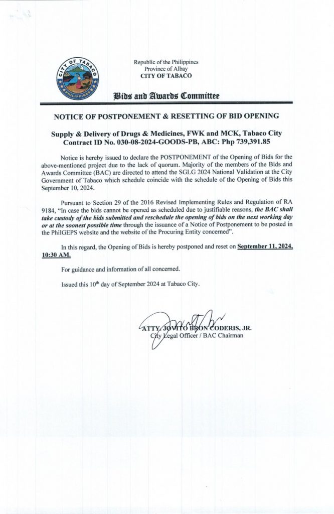 NOTICE OF POSTPONEMENT OF OPENING OF BIDS: Supply & Delivery of Drugs & Medicines, FWK and MCK, Tabaco City, Contract ID No. 030-08-2024-GOODS-PB 2024, Bids and Awards - Posted by: [ Melissa Biron] 4-Notice-of-Postponement-030Download