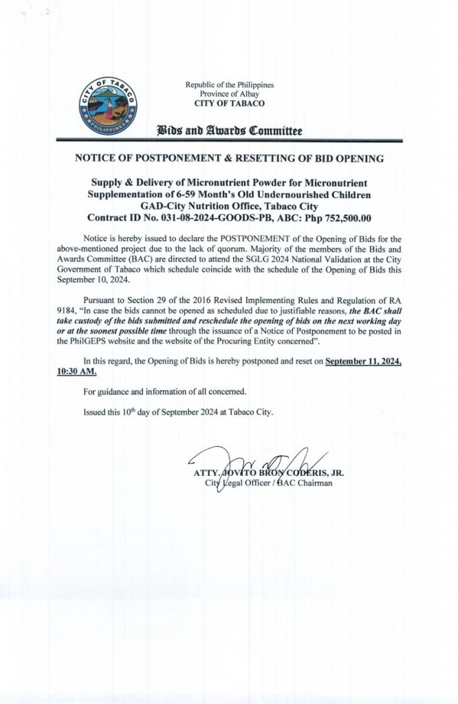 NOTICE OF POSTPONEMENT OF OPENING OF BIDS: Supply & Delivery of Micronutrient Powder for Micronutrient Supplementation of 6-59 Month’s Old Undernourished Children, GAD-City Nutrition Office, Tabaco City, Contract ID No. 031-08-2024-GOODS-PB