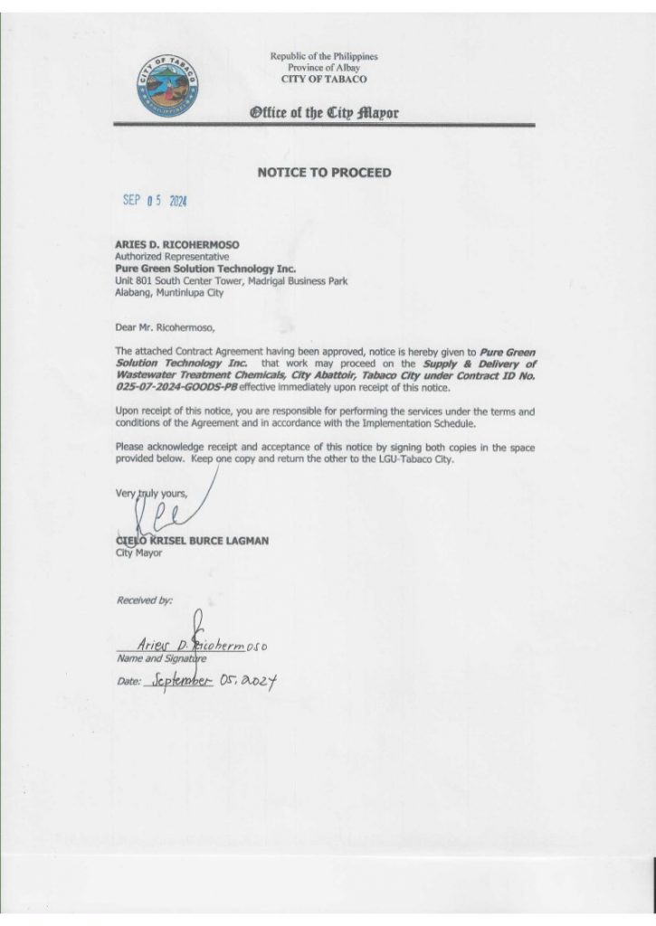 NOTICE TO PROCEED: Supply & Delivery of Wastewater Treatment Chemicals City Abattoir, Tabaco City, Contract ID No. 025-07-2024-GOODS-PB 2024, Bids and Awards - Posted by: [ Melissa Biron] Notice to Proceed-025Download Purchase Order-025Download Contract-025Download