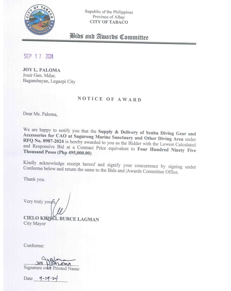 Notice of Award: Supply & Delivery of Scuba Diving Gear & Accessories for CAO at Sagurong, Marine Sanctuary & Other Diving Area, PR No. 24-08-1097