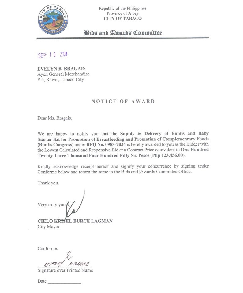 Notice of Award: Supply & Delivery of Buntis & Baby Starter Kit for Promotion of Breastfeeding & Promotion of Complementary Foods (Buntis Congress), PR No. 24-08-1123 2024, Bids and Awards - Posted by: [ Melissa Biron] Download: Award Reso-24-08-1123 – Ayen General Merchandise Download NOA-24-08-1123 – Ayen General Merchandise Download PO-24-08-1123 – Ayen General MerchandiseDownload