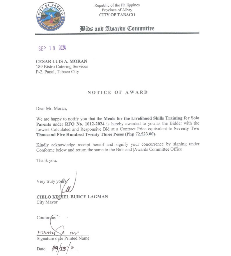 Notice of Award: Meals for the Livelihood Skills Training for Solo Parents, PR No. 24-08-1157 2024, Bids and Awards - Posted by: [ Melissa Biron] Download: Award Reso-24-08-1157 – 189 Bistro & Catering Services Download NOA-24-08-1157 – 189 Bistro & Catering Services Download PO-24-08-1157 – 189 Bistro & Catering ServicesDownload