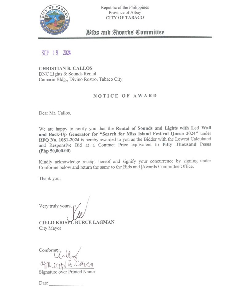 Notice of Award: Rental of Sounds & Lights with LED Wall & Back-Up Generator for “Search for Miss Island Festival Queen 2024”, PR No. 24-09-1229 2024, Bids and Awards - Posted by: [ Melissa Biron] Download: Award Reso-24-09-1229 – DNC Lights & Sound Rental Download NOA-24-09-1229 – DNC Lights & Sound Rental Download PO-24-09-1229 – DNC Lights & Sound RentalDownload