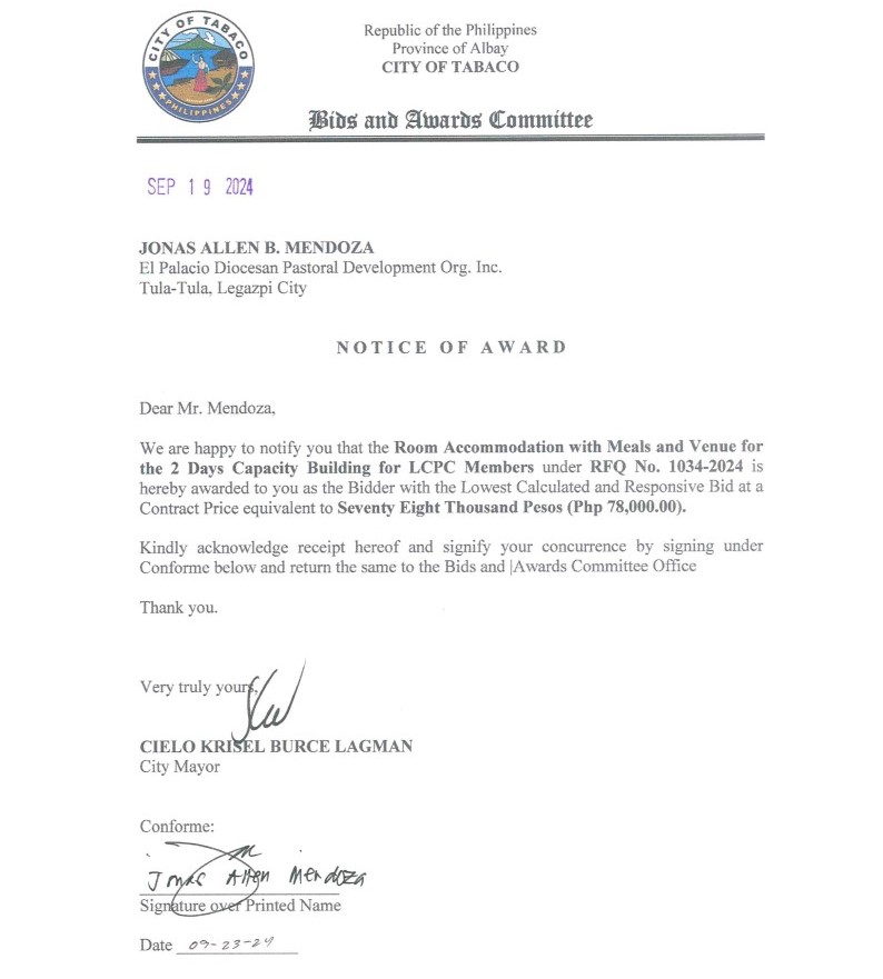 Notice of Award: Room Accommodation with Meals & Venue for the 2 Day Capacity Building for LCPC Members, PR No. 24-09-1180 2024, Bids and Awards - Posted by: [ Melissa Biron] Download: Award Reso-24-09-1180 – El Palacio Diocesan Pastoral Development Org. Inc. Download NOA-24-09-1180 – El Palacio Diocesan Pastoral Development Org. Inc. Download PO-24-09-1180 – El Palacio Diocesan Pastoral Development Org. Inc.Download