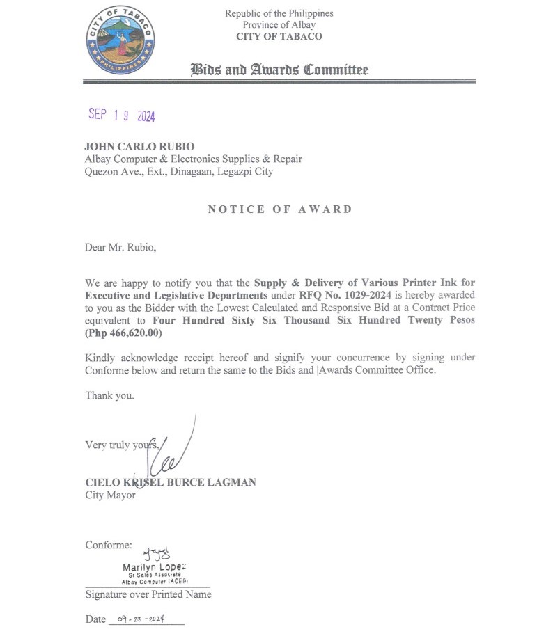 Notice of Award: Supply & Delivery of Various Printer Ink for Executive & Legislative Departments, PR No. 24-08-1163 2024, Bids and Awards - Posted by: [ Melissa Biron] Download: Award Reso-24-08-1163 – Albay Computer & Electronics Supplies & Repair Download NOA-24-08-1163 – Albay Computer & Electronics Supplies & Repair Download PO-24-08-1163 – Albay Computer & Electronics Supplies & RepairDownload