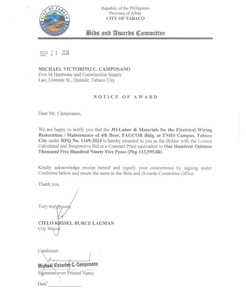 Notice of Award: JO-Labor & Materials for the Electrical Wiring Restoration/Maintenance of 4th floor, PAGCOR Bldg. at TNHS Campus, Tabaco City, PR No. 24-09-1215