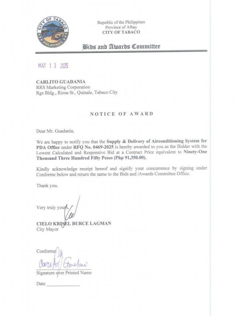 Notice of Award: Supply & Delivery of Air Conditioning System for PDA Office, PR No. 25-04-0533 2025, Bids and Awards - Posted by: [ Melissa Biron] Download: Award Reso-25-04-0533 – RRS Marketing Corp.Download Notice of Award-25-04-0533 – RRS Marketing Corp. Download Purchased Order-25-04-0533 – RRS Marketing Corp. Download