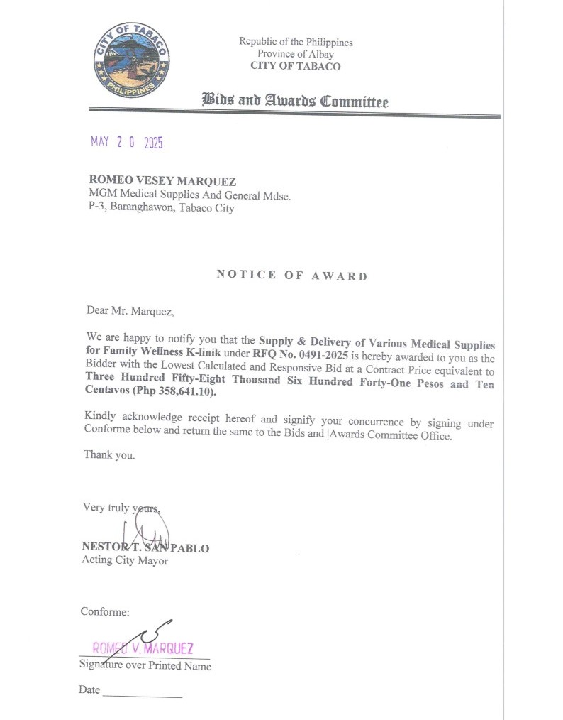 Notice of Award: Supply & Delivery of Various Medical Supplies for Family Wellness K-linik, PR No. 25-05-0555 2025, Bids and Awards - Posted by: [ Melissa Biron] Download: Award Reso-25-05-0555 – MGM Medical Supplies & Gen. Mdse.Download Notice of Award-25-05-0555 – MGM Medical Supplies & Gen. Mdse. Download Purchased Order-25-05-0555 – MGM Medical Supplies & Gen. Mdse. Download