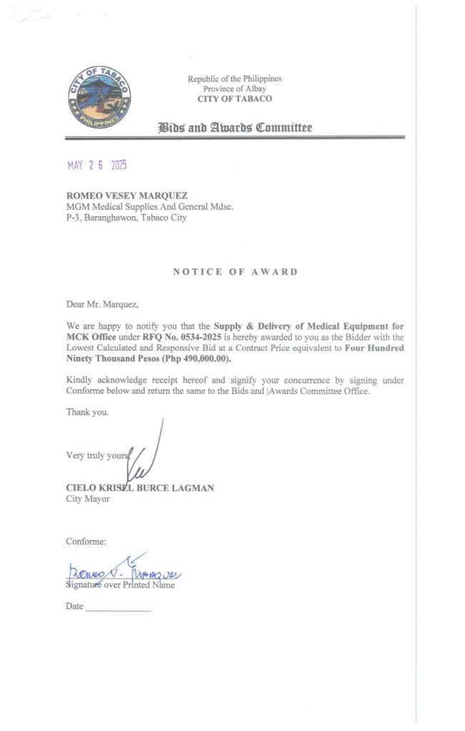 Notice of Award: Supply & Delivery of Medical Equipment for MCK Office, PR No. 25-05-0597 2025, Bids and Awards - Posted by: [ Melissa Biron] Download: Award Reso-25-05-0597 – MGM Medical Supplies & Gen. Mdse.Download Notice of Award-25-05-0597 – MGM Medical Supplies & Gen. Mdse. Download Purchase Order-25-05-0597 – MGM Medical Supplies & Gen. Mdse. Download