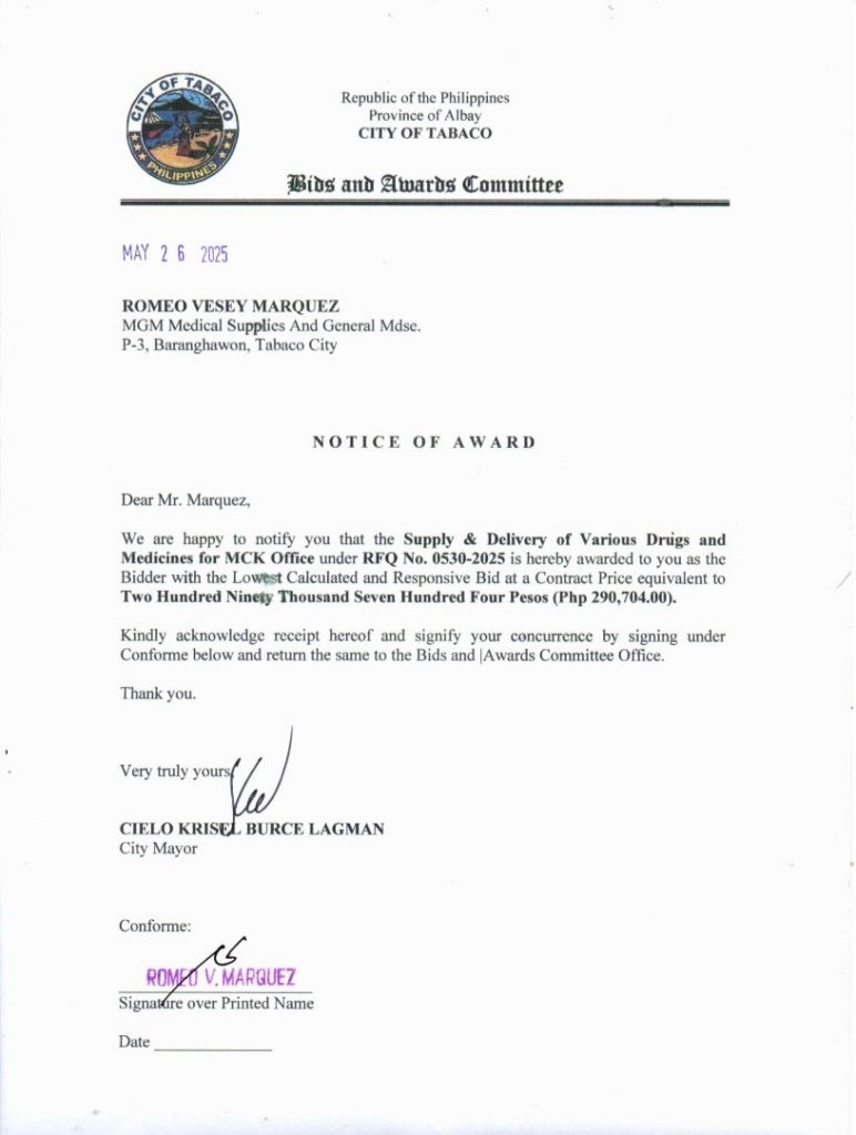 Notice of Award: Supply & Delivery of Various Drugs & Medicines for MCK Office, PR No. 25-05-0593