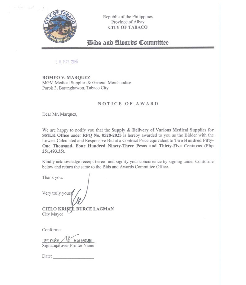 Notice of Award: Supply & Delivery of Various Medical Supplies for SMLK Office, PR No. 25-05-0590 2025, Bids and Awards - Posted by: [ Melissa Biron] Download: Award Reso-25-05-0590 – MGM Medical Supplies & Gen. Mdse.Download Notice of Award-25-05-0590 – MGM Medical Supplies & Gen. Mdse. Download Purchased Order-25-05-0590 – MGM Medical Supplies & Gen. Mdse. Download