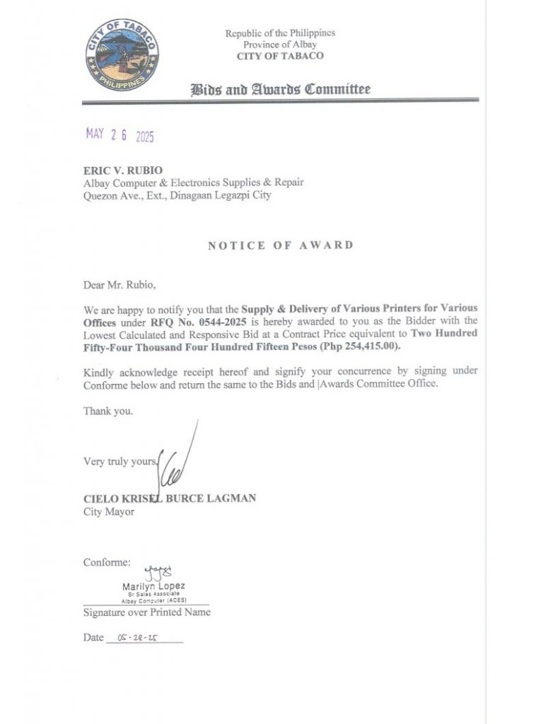 Notice of Award: Supply & Delivery of Various Printers for Various Offices, PR No. 25-05-0607 2025, Bids and Awards - Posted by: [ Melissa Biron] Download: Award Reso-25-05-0607 – Albay Computer & Electronics Supplies & RepairDownload Notice of Award-25-05-0607 – Albay Computer & Electronics Supplies & Repair Download Purchased Order-25-05-0607 – Albay Computer & Electronics Supplies & Repair Download
