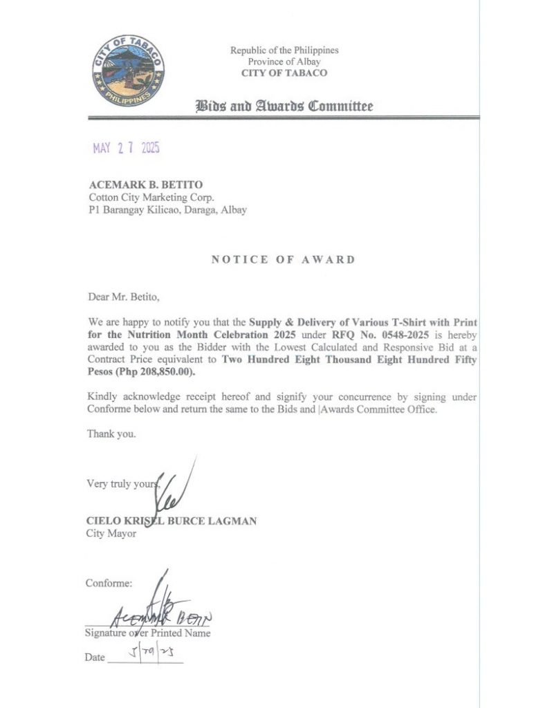 Notice of Award: Supply & Delivery of Various T-Shirt with Print for the Nutrition Month Celebration 2025, PR No. 25-05-0625 2025, Bids and Awards - Posted by: [ Melissa Biron] Download: Award Reso-25-05-0625 – Cotton City Marketing Corp.Download Notice of Award-25-05-0625 – Cotton City Marketing Corp. Download Purchased Order-25-05-0625 – Cotton City Marketing Corp. Download