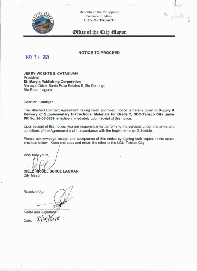 Notice to Proceed: Delivery of Supplementary Instructional Materials for Grade 7, SDO-Tabaco City, PR No. 25-05-0639 2025, Bids and Awards - Posted by: [ Melissa Biron] Download: Notice to Proceed-25-05-0639 – St. Mary’s Publishing Corporation Download Purchase Order-25-05-0639 – St. Mary’s Publishing CorporationDownload