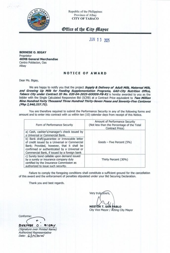 Notice of Award: Supply & Delivery of Adult Milk, Maternal Milk, & Growing Up Milk for Feeding Supplementation Programs, GAD-City Nutrition Office, Tabaco City under Contract ID No. 020-04-2025-GOODS-PB-R1