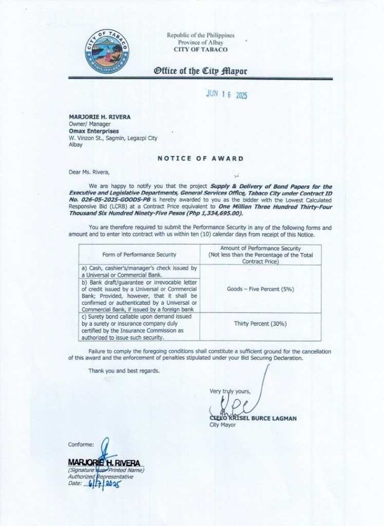 Notice of Award: Supply & Delivery of Bond Papers for the Executive & Legislative Departments, General Services Office, Tabaco City under Contract ID No. 026-05-2025-GOODS-PB 2025, Bids and Awards - Posted by: [ Melissa Biron] Download: Reso Award-026 – Omax EnterprisesDownload NOA-026 – Omax EnterprisesDownload