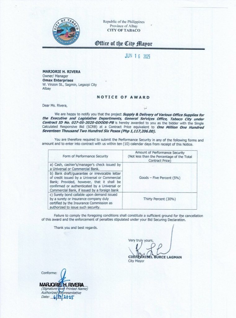 Notice of Award: Supply & Delivery of Various Supplies for the Executive & Legislative Departments, General Services Office, Tabaco City under Contract ID No. 027-05-2025-GOODS-PB 2025, Bids and Awards - Posted by: [ Melissa Biron] Download: Reso Award-027 – Omax Enterprises Download NOA-027 – Omax Enterprises Download