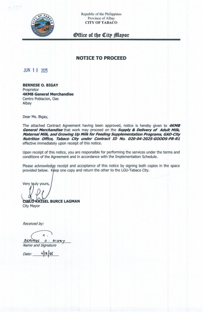 Notice to Proceed: Supply & Delivery of Adult Milk, Maternal Milk, and Growing Up Milk for Feeding Supplementation Programs, GAD-City Nutrition Office, Tabaco City under Contract ID No. 020-04-2025-GOODS-PB-R1