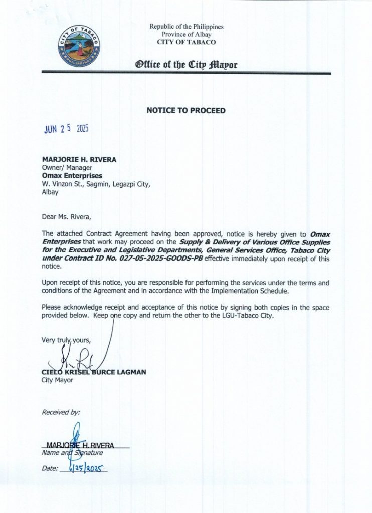 Notice to Proceed: Supply & Delivery of Various Office Supplies for the Executive & Legislative Departments, General Services Office, Tabaco City under Contract ID No. 027-05-2025-GOODS-PB 2025, Bids and Awards - Posted by: [ Melissa Biron] Download: NTP-027 – Omax EnterprisesDownload PO-027 – Omax Enterprises Download Contract-027 – Omax Enterprises Download